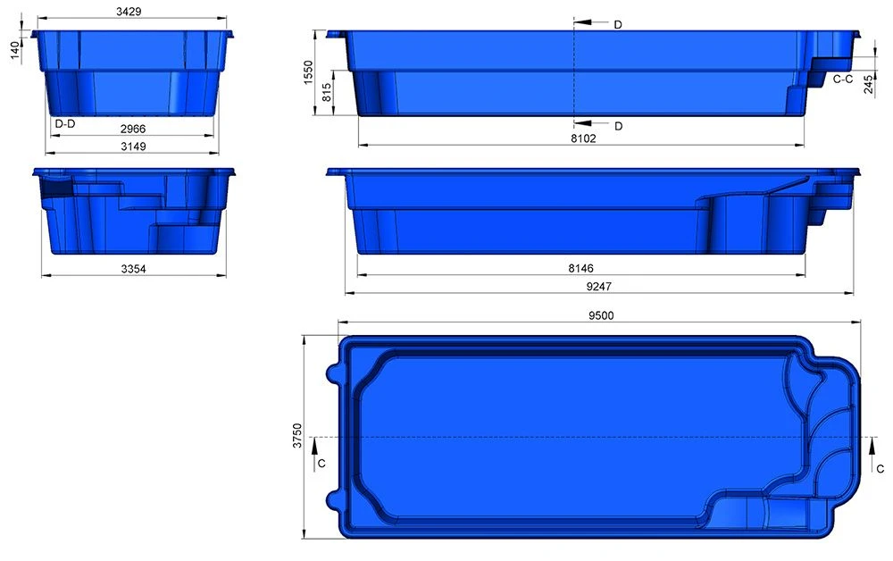 | Pool Wall Details | 10 layers: Gel coat resistant to UV radiation and chemicals, Double anti-osmosis layer (Barrier coat, Skin coat), Vinylester resin + glass fibre mat 300 gr / m2, Vinylester resin + double layer of glass fibre mat 450 gr / m2, Woven roving, Vinylester resin + triple layer of glass fibre mat 600 gr / m2, Metal reinforcement with double layer of polyester resin and glass fibre, Top coat, Polyurethane foam (*Optional 40mm foam insulation layer available). |