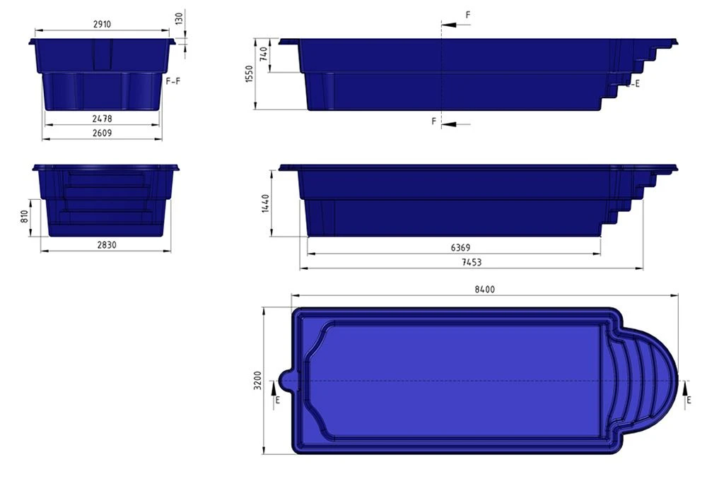 | Pool Wall Details | 10 layers: Gel coat resistant to UV radiation and chemicals, Double anti-osmosis layer (Barrier coat, Skin coat), Vinylester resin + glass fibre mat 300 gr / m2, Vinylester resin + double layer of glass fibre mat 450 gr / m2, Woven roving, Vinylester resin + triple layer of glass fibre mat 600 gr / m2, Metal reinforcement with double layer of polyester resin and glass fibre, Top coat, Polyurethane foam (*Optional 40mm foam insulation layer available). |