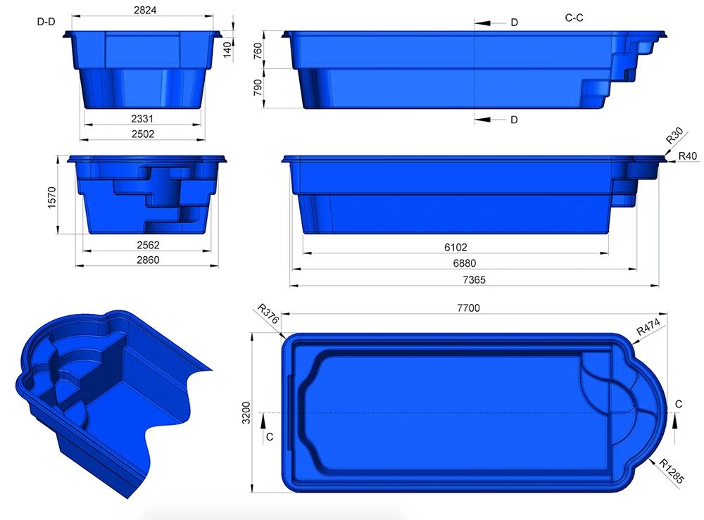 | Pool Wall Details | 10 layers: Gel coat resistant to UV radiation and chemicals, Double anti-osmosis layer (Barrier coat, Skin coat), Vinylester resin + glass fibre mat 300 gr / m2, Vinylester resin + double layer of glass fibre mat 450 gr / m2, Woven roving, Vinylester resin + triple layer of glass fibre mat 600 gr / m2, Metal reinforcement with double layer of polyester resin and glass fibre, Top coat, Polyurethane foam (*Optional 40mm foam insulation layer available). |