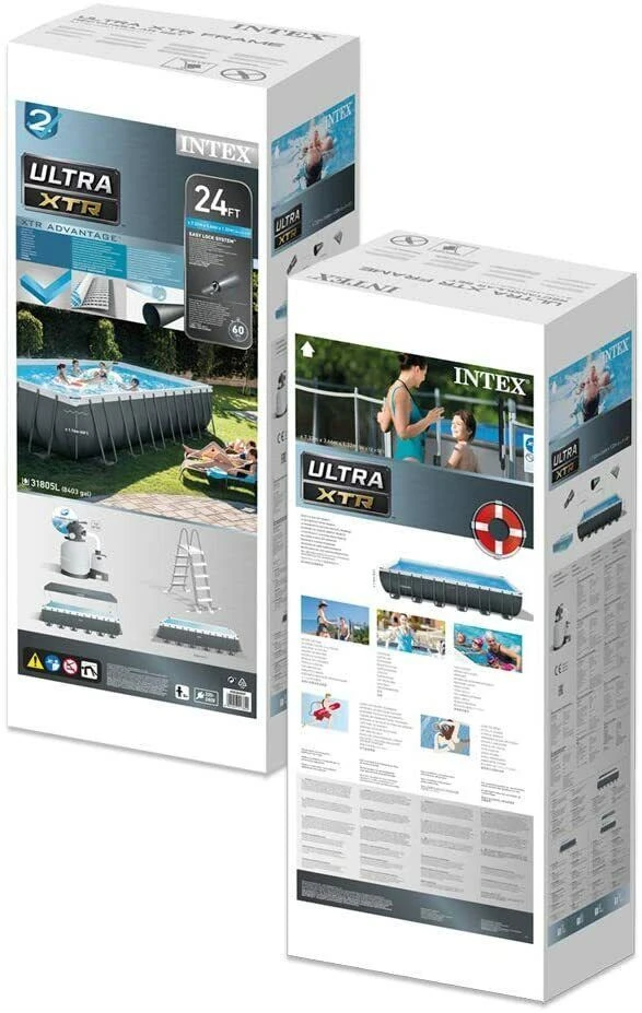 PRE-SEASON SALE – LIMITED STOCK – Intex model 26364 24ft x 12ft x 52″ (7.32m x 3.66m x1.32m) Pool Set Steel Ultra XTR Frame with Filter Pump – Rectangular, water capacity 6,996 gallons (31,805 litres). Includes sand filter pump model SX2100, ladder, ground cloth and debris cover. A great garden pool. Ready for water in 60 minutes. Easy to assemble frame with strong powder-coated steel tubing. Please note: COLLECTION FROM STORE ONLY, please contact us for estimated pallet kerbside delivery quote.