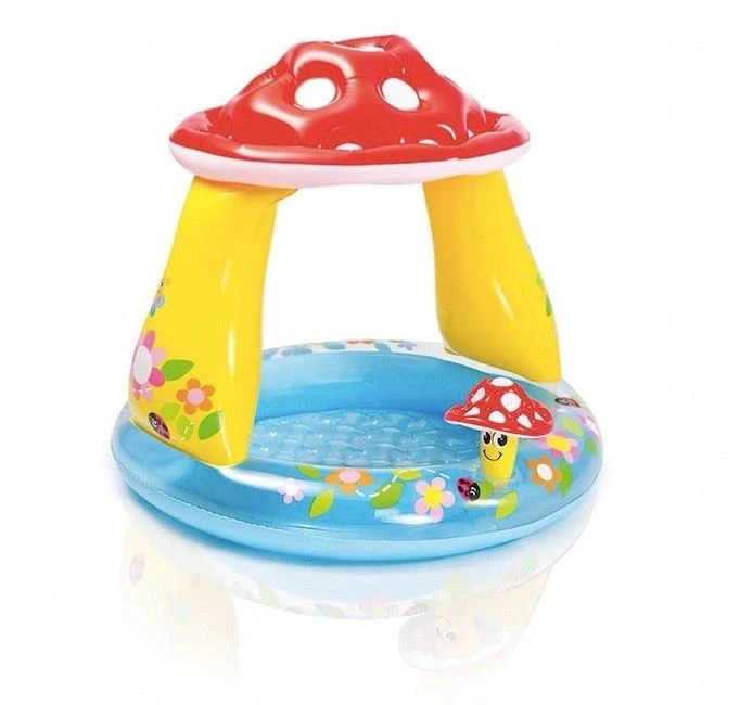 Baby Pool with built-in mushroom sunshade and soft inflatable floor. Made from 10 gauge (0.25mm) vinyl. Size 40″ x 35″ (1.02m x 89cm) inflated. Water capacity 5″ (13cm) of wall height: 10 gal (45L). Repair patch included. Suited for children age: 1 – 3 years.