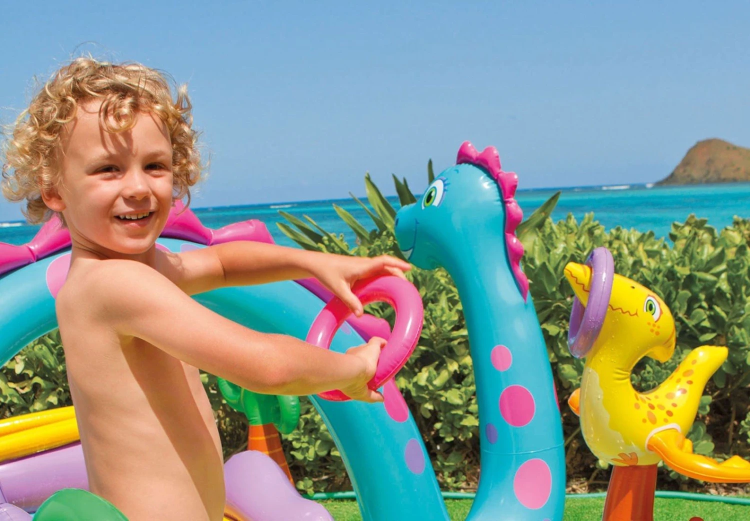 Intex Inflatable Dinoland Play Center (9’11″L x 7’6″W x 3’8″H ) with water slide, paddling pool, landing mat, moveable water sprayer arch, water games and toys, is perfect for children to enjoy a great time in the garden.