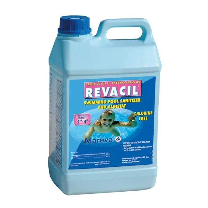 Mareva Revacil Polymeric Biguanide Sanitizer. Revacil is a multifunctional chlorine-free disinfectant. REVACIL contains a Biguanide based chlorine-free sanitizer, reinforced with an algaecide and an anti-scaling agent. REVACIL is compatible with bromine or chlorine based treatments. REVACIL is very resistant to UV rays and heat. REVACIL treats your pool water without damaging skin or bathing suits. Revacil Contents: PolyHexamethylene Biguanide Chlorhydrate + phosphonic acid + polymerised quaternary ammonium.