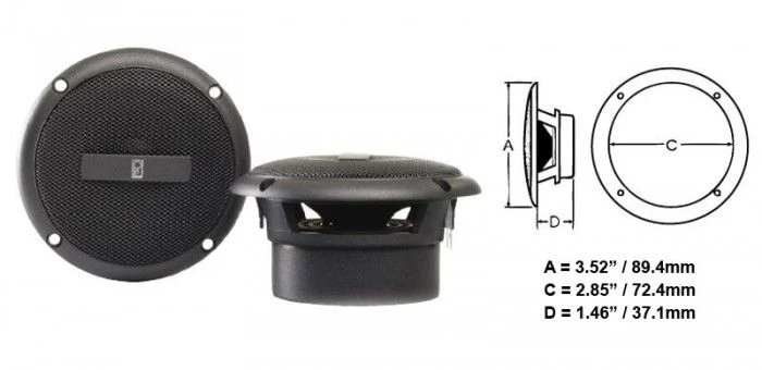 The MA3013 is a 3€ Flush mount speaker are great for installations where mounting space is limited. This compact speaker is designed to be used alone or conjunction with the MS series Subwoofer systems. Ideal for mounting in flybridge overheads, smaller cabins or wherever space is at a premium. Features: 3″ Cone. 60 watt, Flush Mount, Mid range Speaker. Low Magnetic Field. Waterproof construction throughout. Powder coated stainless steel grill. Mounting Hardware & Speaker Wire Included. Quick Connect Terminals. Meets or Exceeds 600hrs ASTM UV & Salt Spray Test. Specifications: Frequency Response: 70Hz to 20KHz (Single cone). SPL: 83dB. Peak Power: 60 watts per speaker. Continuous Power: 30 watts RMS/speaker. Speaker Impedance: 4 ohms. Weight (each): 0.